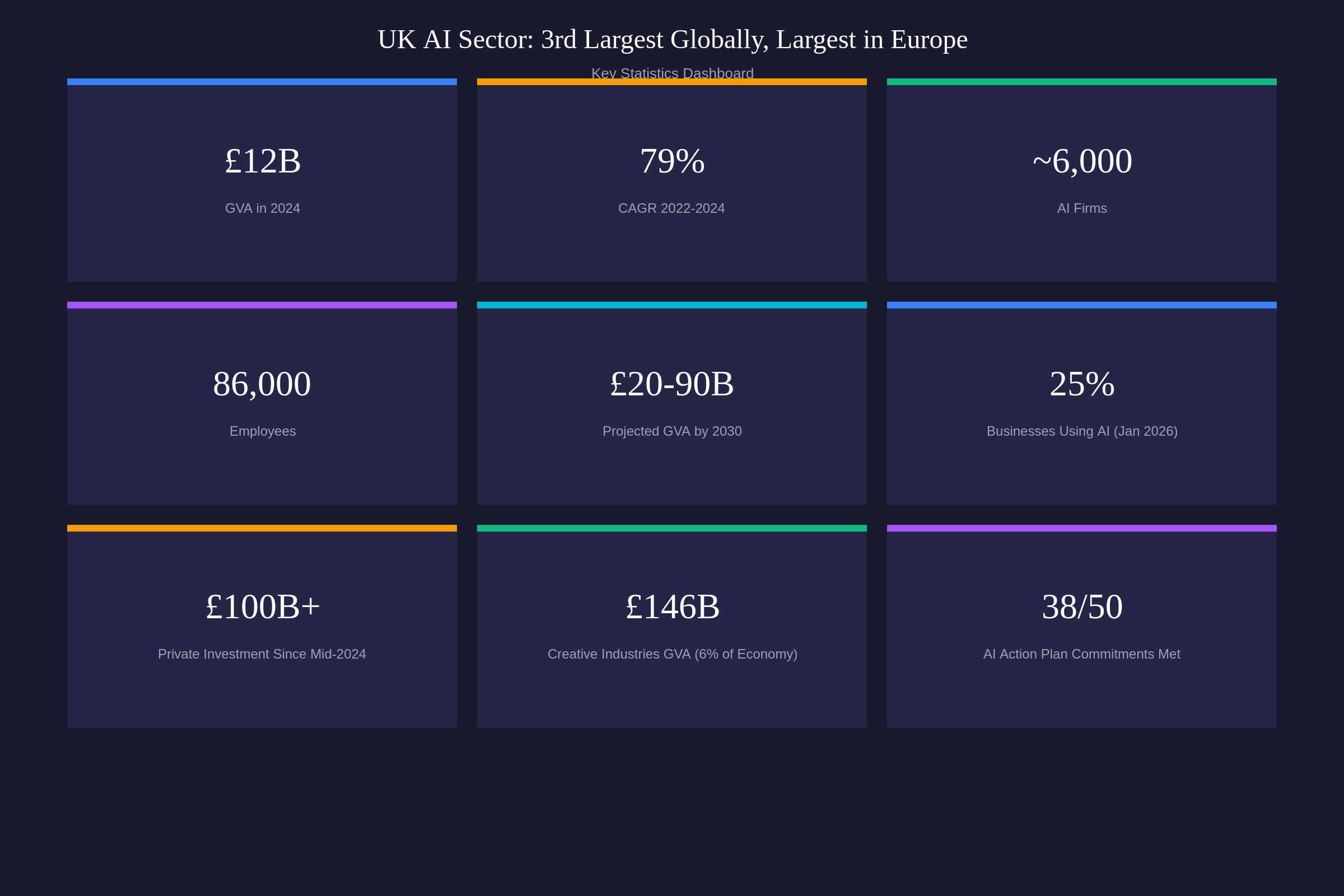 The UK’s AI sector contributed £12 billion in gross value added in 2024 and could reach £20–90 billion by 2030. With over £100 billion in private investment since mid-2024, the UK is a global AI powerhouse.
